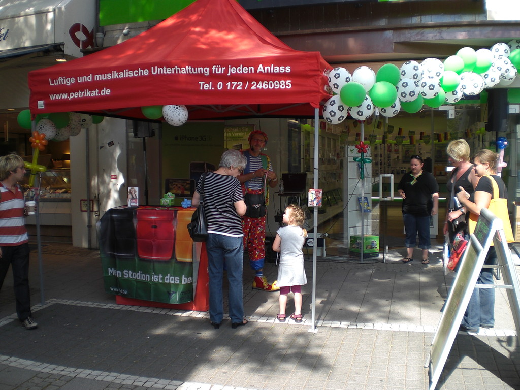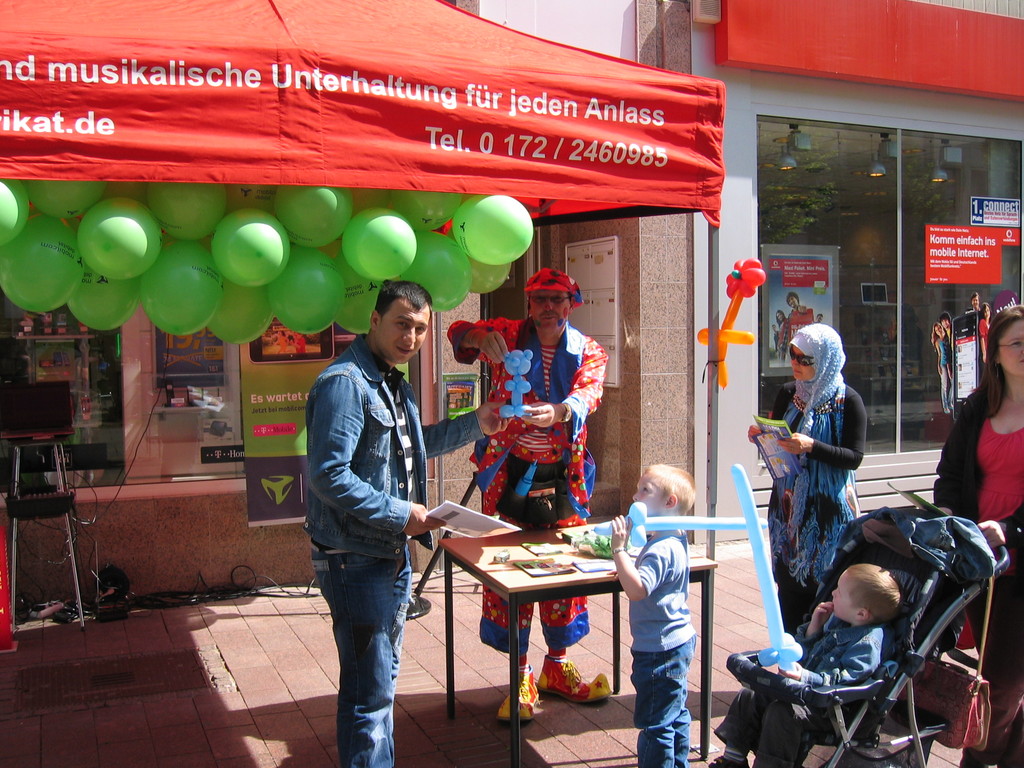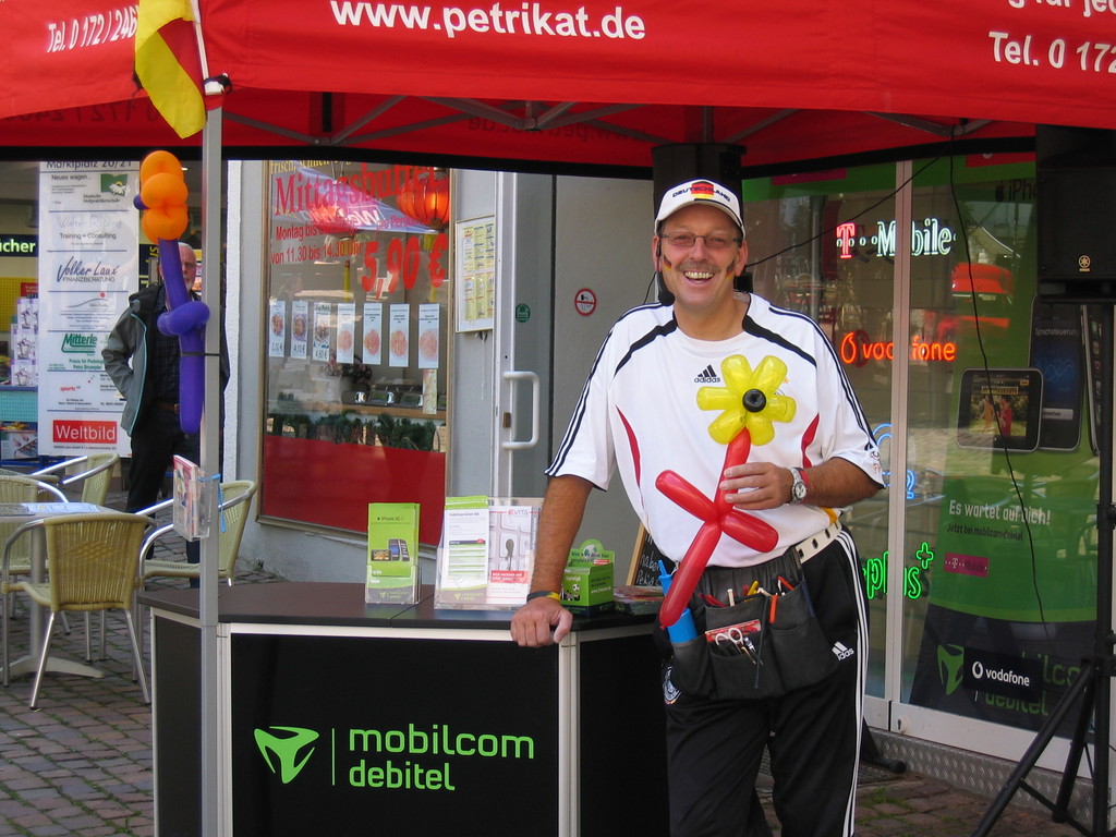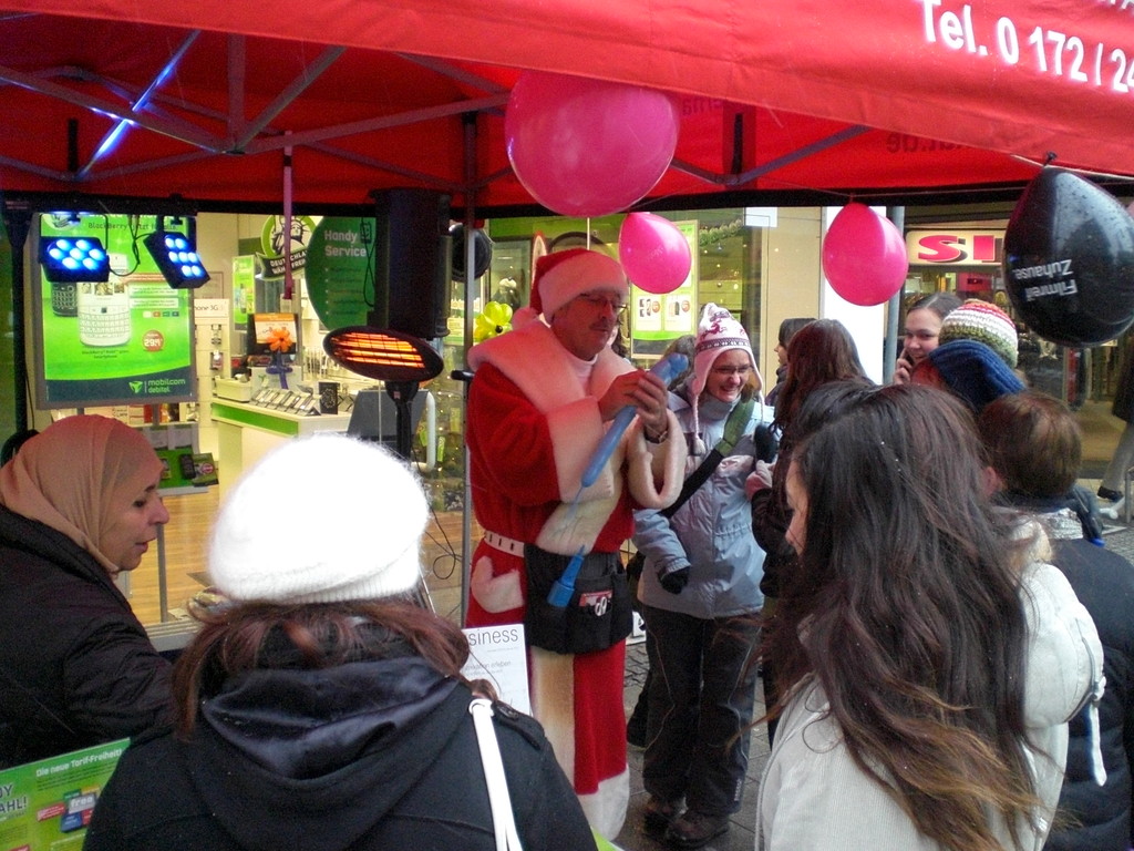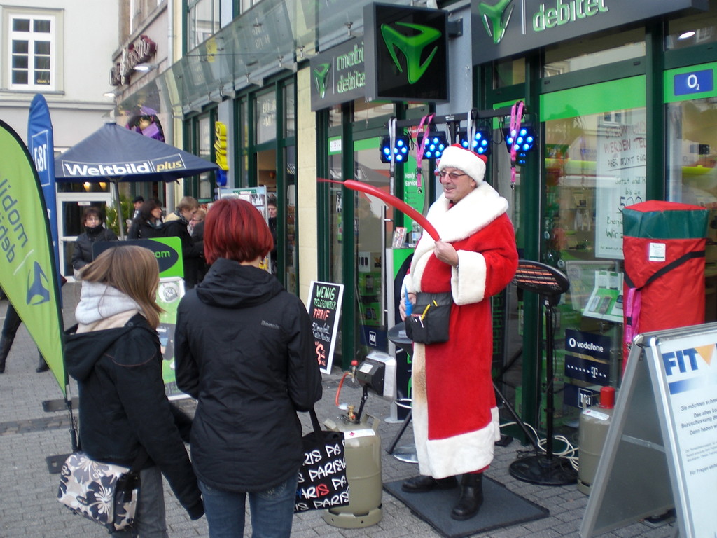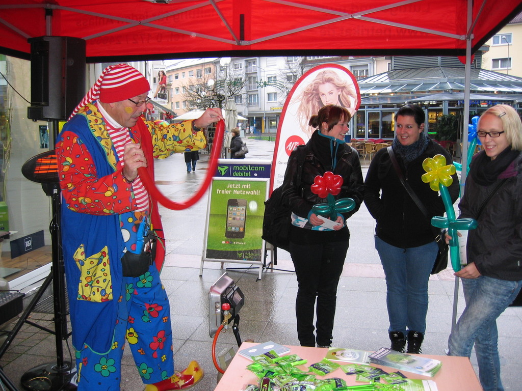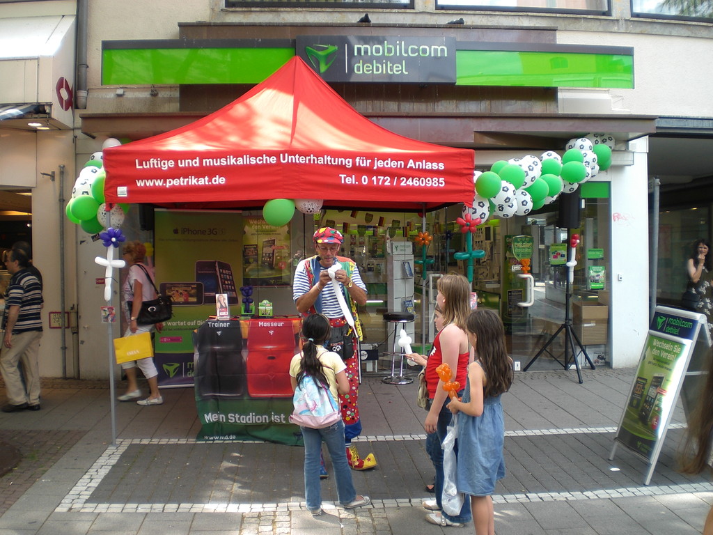 Liebe Besucher meiner Homepage. Für mobilcom-debitel bin ich seit 2009 regelmäßig im Einsatz. Kundenbezogene Werbung mit dem Ballonclown Reinoldi, zur Fußballweltmeisterschaft als Fußballer Reinoldi, zur Weihnachtszeit als menschlicher Weihnachtsmann. Durch die Ballonshow, unterstützt mit CD-Musik, werden die vorbeigehenden Menschen auf mobilcom-debitel aufmerksam gemacht und die Mitarbeiter bieten sofort und direkt die Produkte von mobilcom-debitel an. Eine sehr effektvolle Direktwerbung :-) Bitte schauen Sie sich die Bilder und Filme an, wenn Sie interessiert sind setzen Sie sich bitte mit mir in Verbindung !