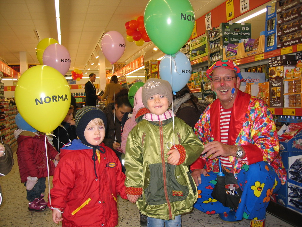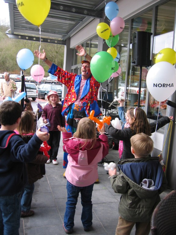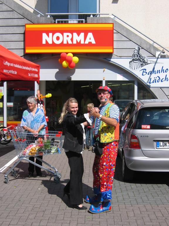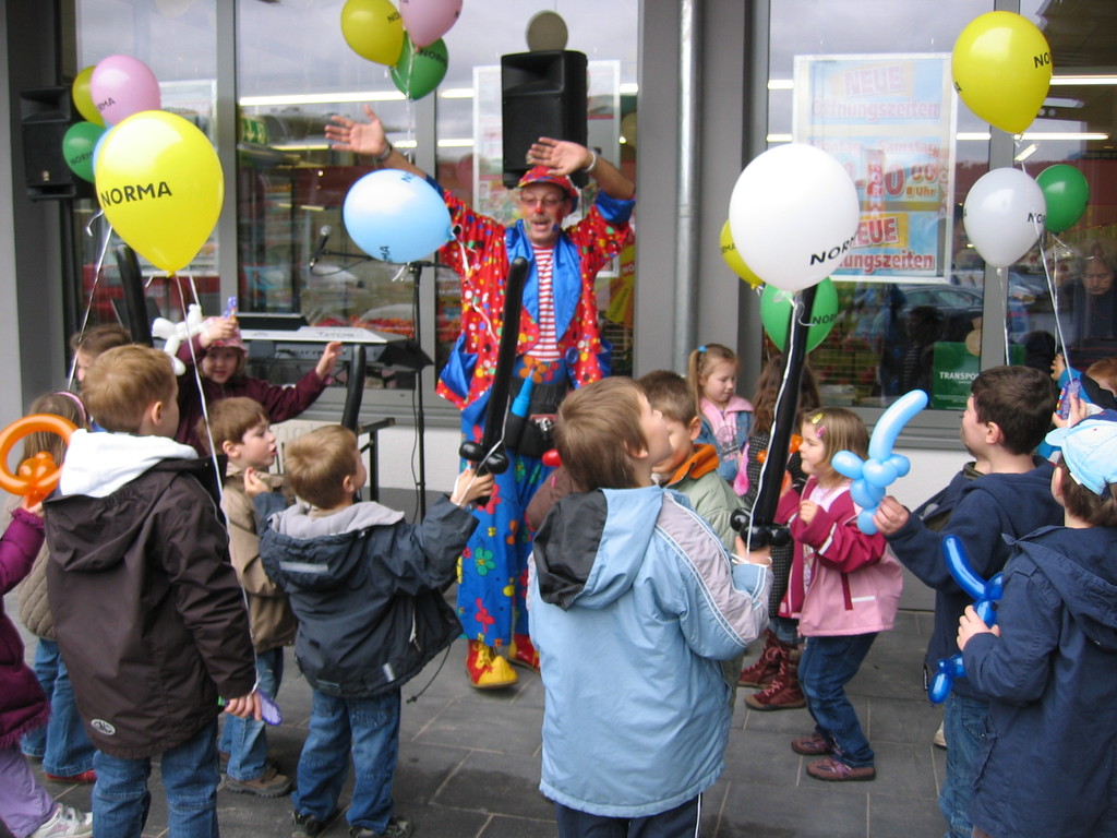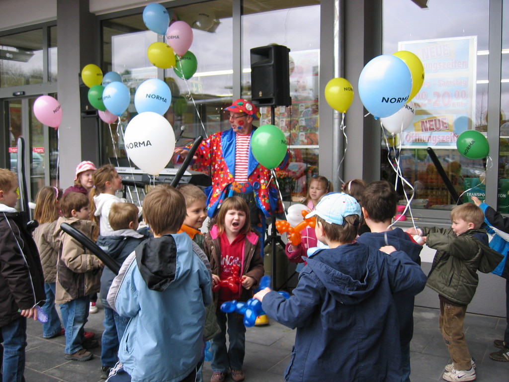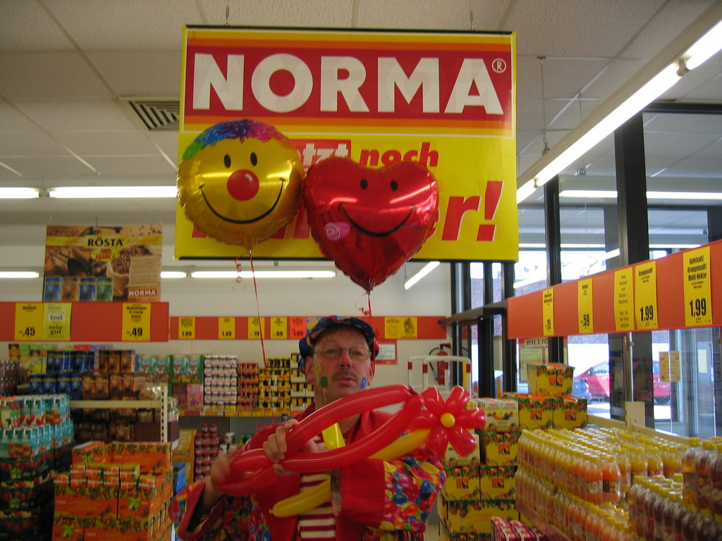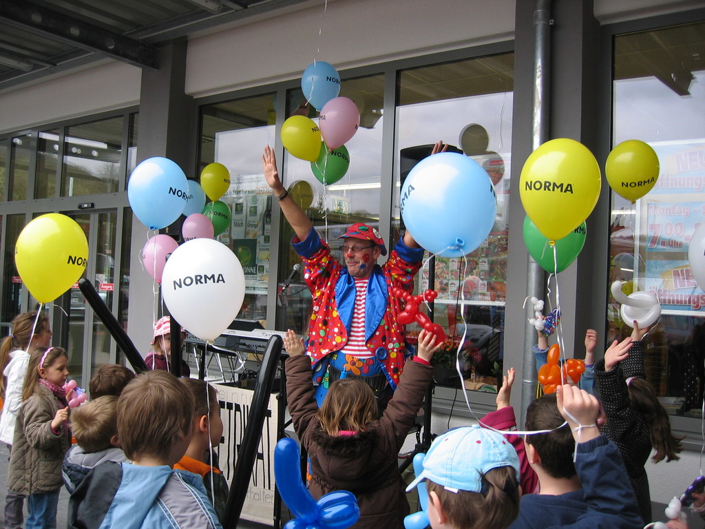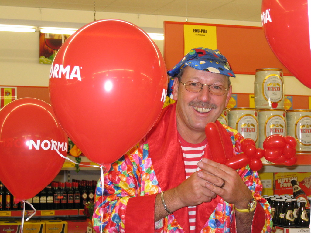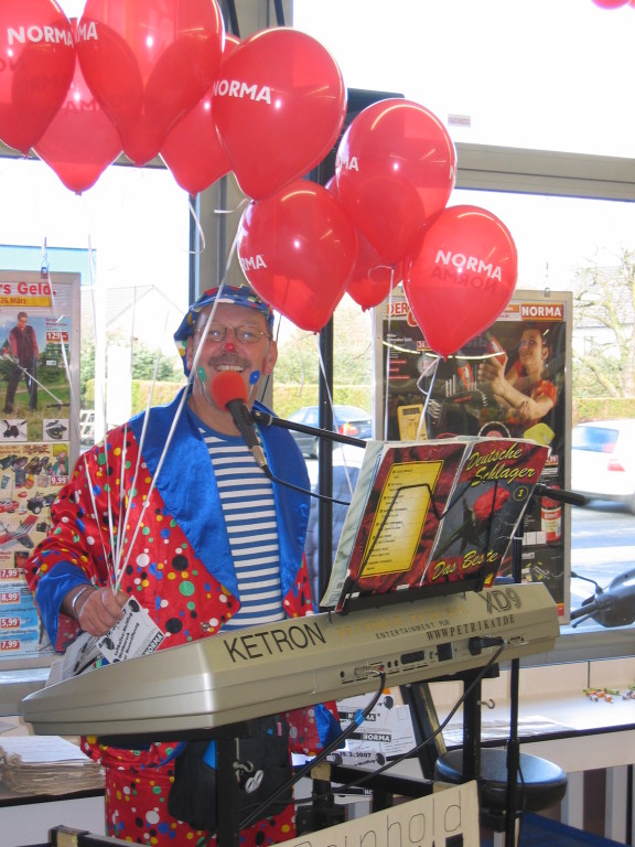 Sehr geehrte Besucher meiner Homepage, für NORMA bin in den Gebieten der Niederlassungsleitungen von NRW und Rheinland-Pfalz schon oft tätig gewesen. Gerne kann ich auch für Sie tätig werden und Ihre Neueröffnungen oder sonstige Events mit meinen Diensten und Eventmodulen bereichern. Dabei kann ich mir Vorstellen am Tag vor der Eröffnung oder des Events eine Ballondekoration anzubringen, am Tag der Eröffnung kann der "Ballonclown Reinoldi" anwesenden Kindern und deren Eltern die schönsten Ballonfiguren erstellen und in Ihrem Namen verschenken, desweiteren kann die Clown-Hüpfburg aufgebaut werden und wenn gewünscht kann ich die Gäste auch mit Live-Musik am Keyboard oder zur mit CD-Musik unterhalten. Bitte schauen Sie sich die Bilder und Filme von NORMA an. Vielen Dank für Ihren Besuch auf meiner Homepage.