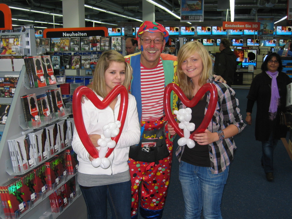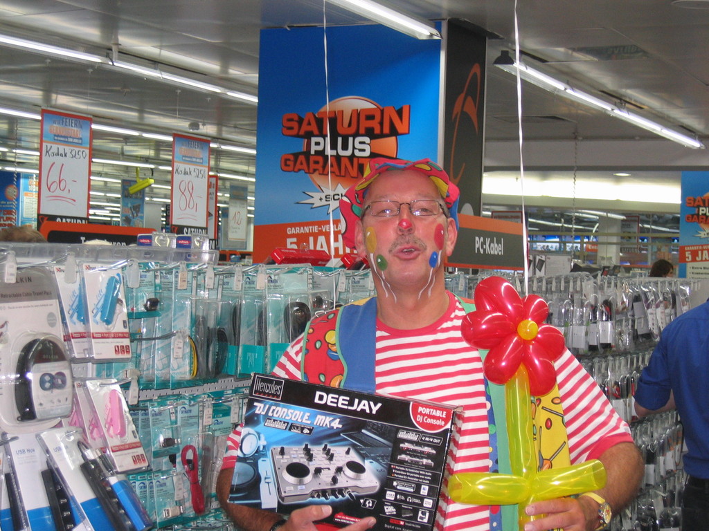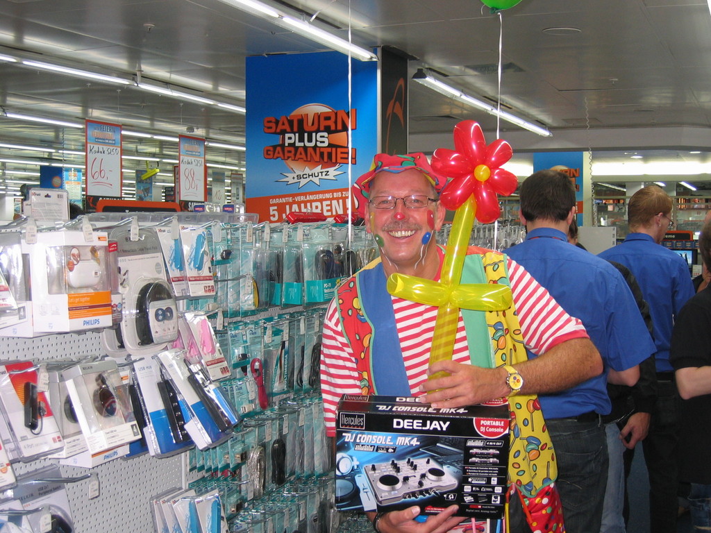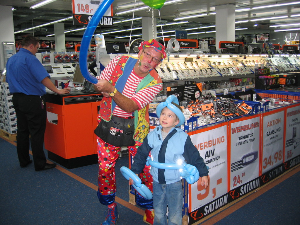 Sehr geehrte Betrachter meiner Homepage. Seit Jahren bestellt mich der SATURN Remscheid zur Geburtstagsunterhaltung. "Die witzige Luftballonshow mit Clown Reinoldi" wird dann größtenteils durchgeführt. Schöne Ballondekorationen habe ich auch schon für SATURN Remscheid gefertigt. Weiterhin kann ich Ihnen aber noch mein Glücksrad anbieten. Ich denke auch Popcorn für Groß und Klein würde gut ankommen :-) Wenn ich Ihr Interesse geweckt habe würde ich mich über eine Kontaktaufnahme freuen. Bitte schauen Sie sich vorher meine Bilder und Filme an. Vielen Dank für Ihre Aufmerksamkeit.